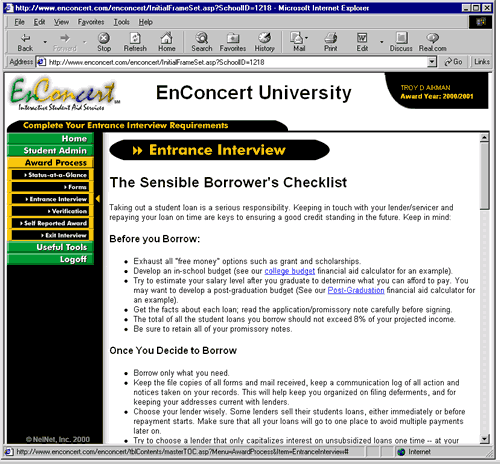 Nconcert also provides the federally required entrance and exit counseling for student loan borrowers. Students may take a short online quiz and have the results forwarded to their financial aid office.