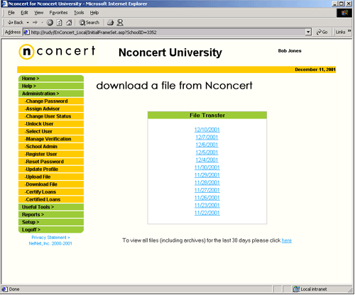 Nconcert enables Administrators to download specific data files based on security level access. Files on Nconcert are available for 30 days and are listed in chronological order.