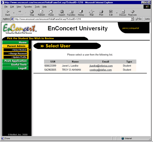 Parents may access their student's information through Nconcert if the student has given them access to do so. By selecting their student's name, a parent can fill out forms and use their student's information to fill out a PLUS Application.